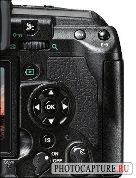 Под большим пальцем правой руки расположено второе управляющее колесо. Его местоположение справа от видоискателя унаследовано от Olympus E-1. Лично мне оно кажется более логичным, чем расположение в правой части камеры, так как большой палец сразу ложится на колесо и его не нужно выгибать, уменьшая плотность ухвата камеры для переключения параметров.