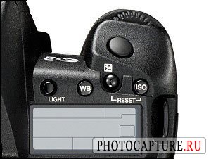 Справа от пентапризмы находится более привычная группа кнопок: кнопка переключения ISO с шагом в 1/3 ступени, экспокоррекция в диапазоне +/-5 ступеней с шагом в 1/3 ступени, переключатель баланса белого и кнопка включения/выключения подсветки статусного ЖК-дисплея. Рядом находится кнопка спуска, имеющая нетрадиционную для Olympus форму. Глядя на кнопку спуска и наплыв под ней, возникает настоящее дежавю - уникальное сходство с кнопкой спуска профессиональной серии Canon EOS 1D. Естественно, ни о каком плагиате или заимствовании речи не идет, т.к. именно такая форма идеально соответствует человеческой анатомии. Кроме того, подобная форма встречалась в камерах Minolta профессиональной серии.