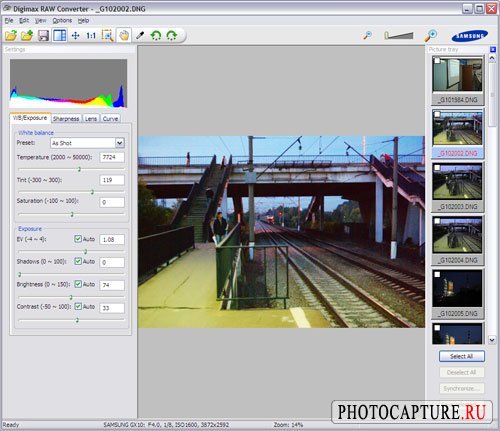 Нам интересен был прежде всего фирменный конвертер DNG файлов Digimax RAW Converter. Интерфейс «слизан» с конвертера Адоби. Клон получился качественным. Мы сравнили конвертирование с программой для фотографов Adobe Lightroom. Результаты практически идентичны. Автоматические параметры Лайтрума оказались более подходящими, а управление более гибким и удобным. В Диджимаксе можно получить ту же картинку, но путём ручных манипуляций. Авторежим преподносит изображение не в лучшем виде.