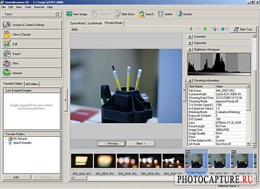 EX Zoom Browser - программа для просмотра изображений. Позволяет просматривать картинки, отснятые Вашей камерой, и не только. Несколько режимов просмотра изображений позволяют выбрать наиболее удобный для Вас вариант. Ниже представлен скриншот в режиме "preview": окно просмотра выбранного изображения, окошко с уменьшенными изображениями в папке и окно с информацией о выбранной фотографии позволяют быстро и удобно просмотреть изображения, узнать, когда и при каких настройках она была снята.