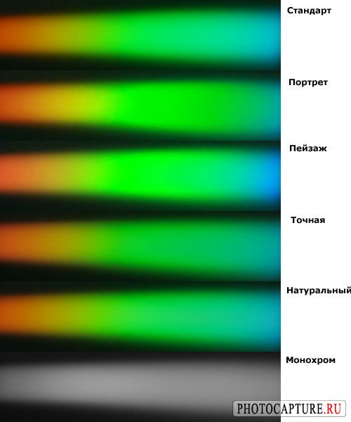 Этот тест наглядно показывает, что при настройке "Портрет" лучше других проработана оранжевая и желтая часть спектра, отвечающая за передачу телесных оттенков. При настройке "Пейзаж" акцент смещен на синюю и зеленую часть спектра, важные для реалистичной передачи цветов зеленой травы и голубого неба.