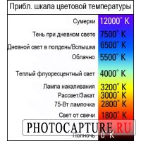 В таблице на изображении ниже показана приблизительная шкала цветовой температуры. Помните, что настройка баланса белого "Дневной свет" составляет 5300K.