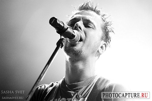 Как это ни печально, но именно от сценического света во многом зависит, какой кадр у вас получиться. Как бы хорошо вы не «ловили момент» и выстраивали композицию – плохое сценическое освещение все это загубит. Если музыкант выступает на крупных площадках (типа Олимпийского) и особенно если с ними работает хороший светорежиссер – проблем, как правило, не бывает. Но когда группа выступает в небольшом клубе или работы светорежиссера нет как таковой… тогда шансы сделать интересную фотографию близятся к нулю. На моей памяти был случай, когда на презентации одной группы в клубе Б-2 музыканты выступали вообще без сценического света . Освещение было только от обычных ламп, освещающих зал… Но это скорее исключение, обычно все не так плохо.