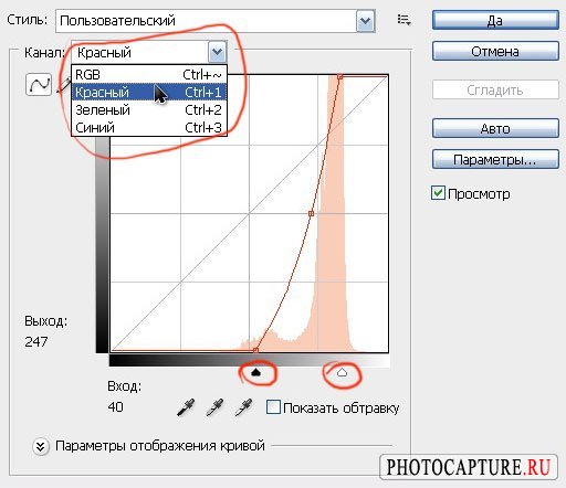Затем берём чёрную пипетку и кликаем по самой тёмной точке на фотографии, затем берём среднюю, серую пипетку и кликаем ею по серой точке. Хочу заметить, что Вы можете пробовать не одну точку на фотографии, а кликать и искать наилучшую область до тех пор, пока Вас не устроит результат. Также в окне 'Кривые' можно корректировать фотографию по отдельным каналам (красный, зелёный и синий):
