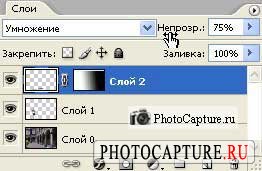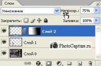 Ну вот уже почти всё, остался небольшой штришок, а именно надо тень нашу сделать попрозрачней, для этого в палитре "Layers" ("Слои"), настройте режим смешивания на "Multiply" и режим "Opacity" ("Непрозрачность") на 75%, но это, как я говорил выше, зависит от фотографии (а именно от времени суток на фотографии), я настроил здесь так и этого достаточно.