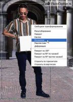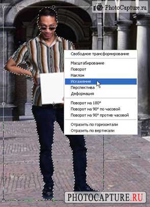 Ну что же, собственно теперь переходим к основной части нашей задачи, к тени. Кликнем по слою с человеком с нажатой клавишей "Ctrl", таким образом, получим выделение, соответствующее форме человека, затем запускаем инструмент "Transform selection" ("Трансформирование выделения"), он находиться в меню "Selection" ("Выделение"), и трансформируйте выделение как показано на фото ниже. Обратите внимание на тени уже существующие на фоновой фотографии, и выделение трансформируйте параллельно им.